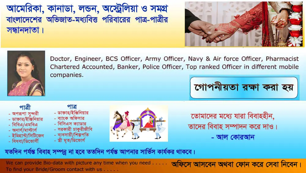 Kazi-Marriage-Media-new (1)বিসমিল্লাহির রাহমানির রাহিম কাজী ম্যারেজ মিডিয়া শিক্ষিত, মার্জিত পাত্র-পাত্রীর সন্ধান দাতা Home About us Contact us